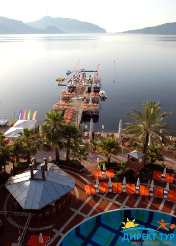 Отдых в отеле очень понравился. При возможности приехал бы туда еще. Территория отеля не большая, но очень уютная, рационально используется каждый участочек земли. Персонал отеля приветливый и доброжелательный, впрочем, как и все турки. Питание в отеле хорошее, все очень вкусно и разнообразно. Однако нет изобилия мясных блюд, что не портит общую картину. Голодными никогда не были. В номере имеется бесплатный сейф с электронным замком, что является большим плюсом. К сожалению, в информации о фитнес-центре нигде не сказано, что для занятий на тренажерах необходимо иметь с собой спортивную обувь (шлепанцы и т.п. не подходят). Песчано-галечного пляжа в отеле нет. Возможно, он когда-то и был, но сейчас на его месте расположены столики от ресторана, принадлежащего отелю. Пляж отеля – деревянная платформа, на которой всегда есть свободные места. Вход в море с платформы сплошное удовольствие. После 18-00 убираются шезлонги и матрасы, и эта платформа превращается в ресторан. Для любителей морских прогулок, красивых пейзажей и купания рекомендую поездку по островам Эгейского моря. Получите массу приятных впечатлений всего за 20 $ (в эту сумму входит вполне приличный обед). Напитки, как и на всех экскурсиях, оплачиваются отдельно. Поэтому не забудьте прихватить с собой воду и что-то еще по желанию. Стоимость 1 бутылки воды 0,5 л - 1$, банки пива - 5$. Для любителей экстрима очень рекомендую рафтинг. Получите незабываемые впечатления. Рафтинг в Мармарисе 4 категории сложности, всего их 6, 5 – для профессионалов, 6 – считается не проходимой. Выезжая на рафтинг обувь должна быть соответствующая (лучше всего полукеды или кроссовки) шлепанцы или вьетнамки не подходят. Тем, кто чувствует себя неуверенно в воде или просто решил покататься на лодочке, на рафтинг лучше не ехать. Фото и видеокамеры с собой можно не брать снимать есть возможность только перед стартом. Затем вся эта техника вместе с сухим комплектом одежды и другими вещами остается на базе. Для того, что бы в полной мере ощутить Турецкий колорит сходите или съездите на Bar street, где находится большое количество дискотек и рядом с этой улицей расположена еще одна, на мой взгляд, не менее интересная улочка чисто в турецком стиле. До Bar street каждый день от отеля в 12 ночи отправляется автобус и отвозит всех желающих на дискотеку. Назад автобус отправляется в 3 часа ночи. Проезд и вход на дискотеки бесплатный. Добраться до Bar street так же можно на долмуше (маршрутка). Стоимость проезда 1,25 турецких лир (приблизительно 1$). Если идти пешком это займет времени около 40 мин. Конечно, если задаться целью, то недостатки можно найти всегда и во всем, но в таком случае лучше оставаться дома и вообще никуда не выезжать дабы не портить настроение себе и окружающим.