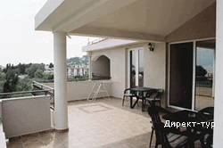 Гостиная с раскладным диваном, полноценная кухня и стол со стульями (выход на большую террасу с видом на море), спальная – французская кровать, выход на маленькую террасу с видом на гору - из спальни и гостиной.