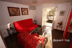 Двухкомнатный апартамент, отремонтирован в 2007 году, состоит из спальни и большой гостиной, рассчитан максимум на 5 человек, площадь 40 м2 + терраса 11 м2 и собственный сад смотрящие в сторону моря. В спальне французская кровать на 2-х человек, в гостиной раскладной диван на 2-х человек, раскладное кресло. Полностью оборудованная большая кухня (плита, холодильник и набор посуды), душ/туалет.
