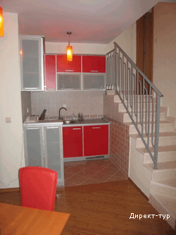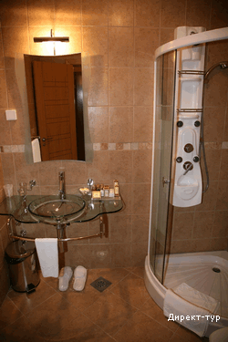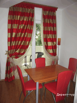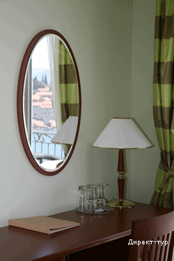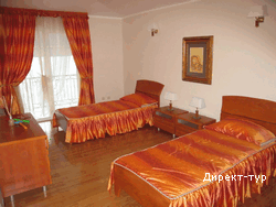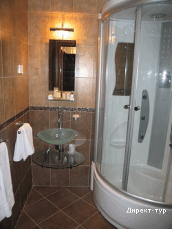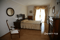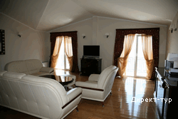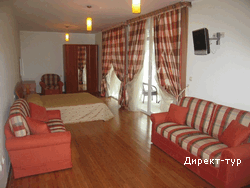 В SUITE: Двухуровневый номер, две спальни (в одной – французская кровать и диван), гостинная с кухней и обеденным столом, необходимая посуда, холодильник, кондиционер, сейф(бесплатный), мини-бар, кабельное телевидение, телефон, доступ к интернету, две террасы, вид на парк, душ с гидромассажем, фен, косметика. Максимальное размещение -4 человека.
