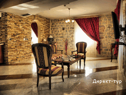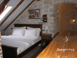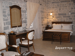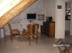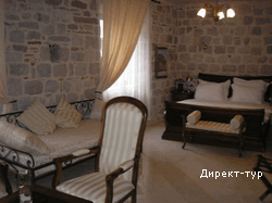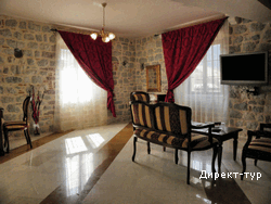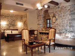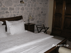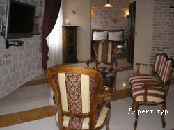 Номер с двумя спальнями (французские кровати), гостиная зона с кухней и мебельным гарнитуром, площадью 72 м2, балкон с видом на собор Св.Трифона. Максимальное размещение - 4 человека.