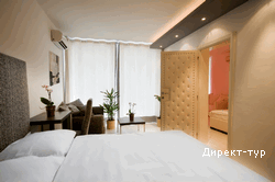 В SUITE DE LUX JUNIOR: Номера выдержаны в расном, оранжевом или черно-белом цветах, в номере-французская кровать и раскладной диванчик, кондиционер, телефон, кабельное телевидение, доступ к интернету, мини-бар (платный), сейф (бесплатно), терраса с видом на море, ванная, фен, косметика(35м2). Масимальное размещение- 3 человека.
