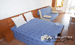 В STD: Двуспальная кровать с возможность дополнительной кровати или диван, встроенный шкаф, интернет, спутниковое ТВ- плазма, кондиционер, фен, холодильник, в ванной душевая кабина, туалет.