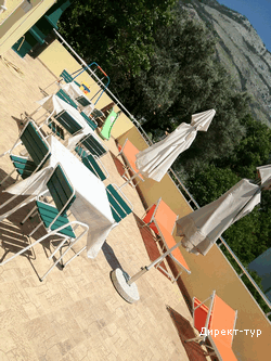 В 300 м от отеля, зонтики и лежаки за дополнительную плату (песочно-галечный).
