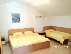 двухэтажная вилла, для размещения предлагается - 2 номера на первом и втором этажах. Перед входом в номер -терраса. Закрытая уютная территория, зеленый газон, фруктовый сад, свой паркинг, зонтики и лежаки -бесплатно, зона барбекю, детская площадка, интернет. Уборка номера и смена полотенец по желанию гостей.
