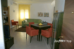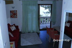 Площадью 45м2 с террасой 12м2, спальная с французской кроватью и гостиная с раскладным диваном, кабельное телевидение, DVD, кондиционер, кухня, обеденный стол, ванная комната, вид на море. Максимальное размещение 4+1.